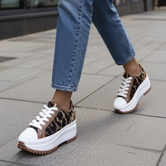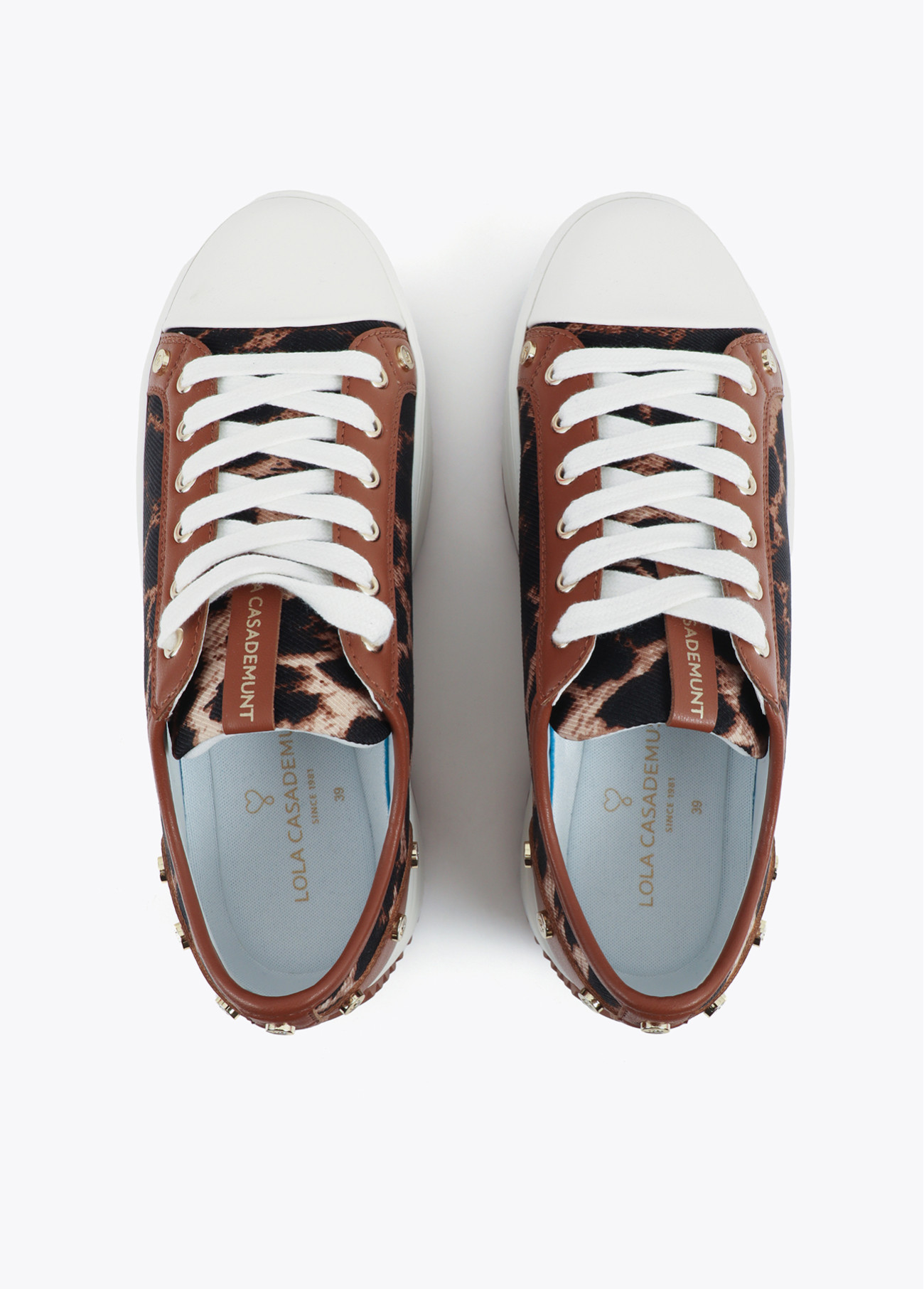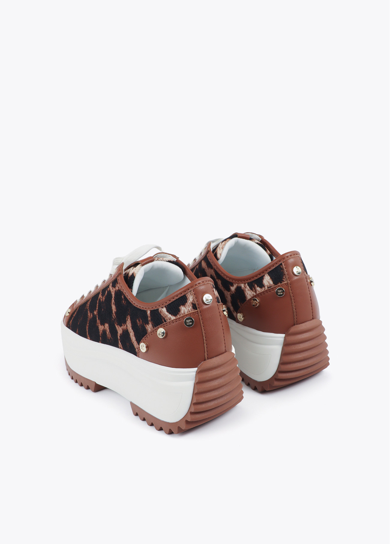 Ge din stil en vild touch med dessa platåsneakers i leopardmönster. Guldfärgade nitdetaljer och tjock sula för extra komfort. Tillverkade av högkvalitativa material som garanterar hållbarhet och komfort. Perfekt för en urban, avslappnad look.