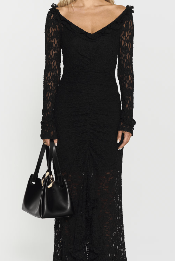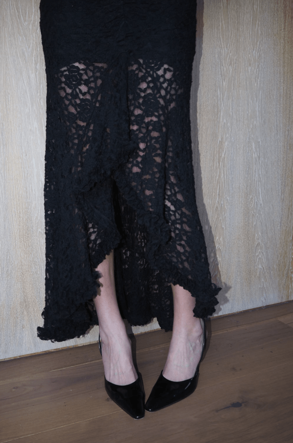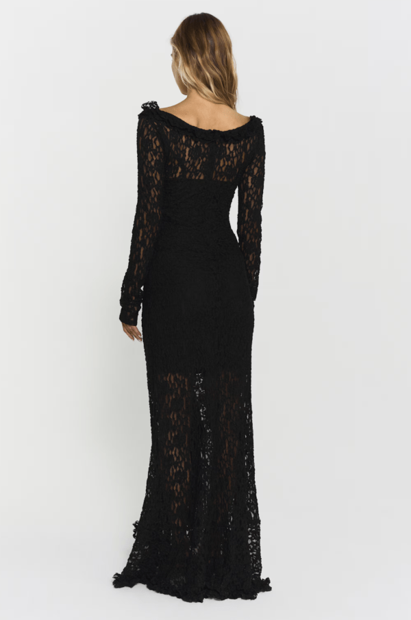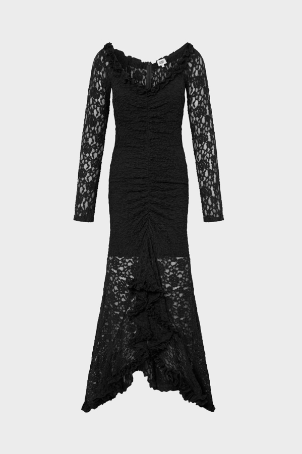 Ashley Lace-klänningen har invecklad spets, en V-ringning med volangdetaljer och elegant rynkad framtill. Den har en bekväm underklänning, en dold dragkedja bak, full längd bak och en slående lång slits fram för en sofistikerad men ändå lockande look.