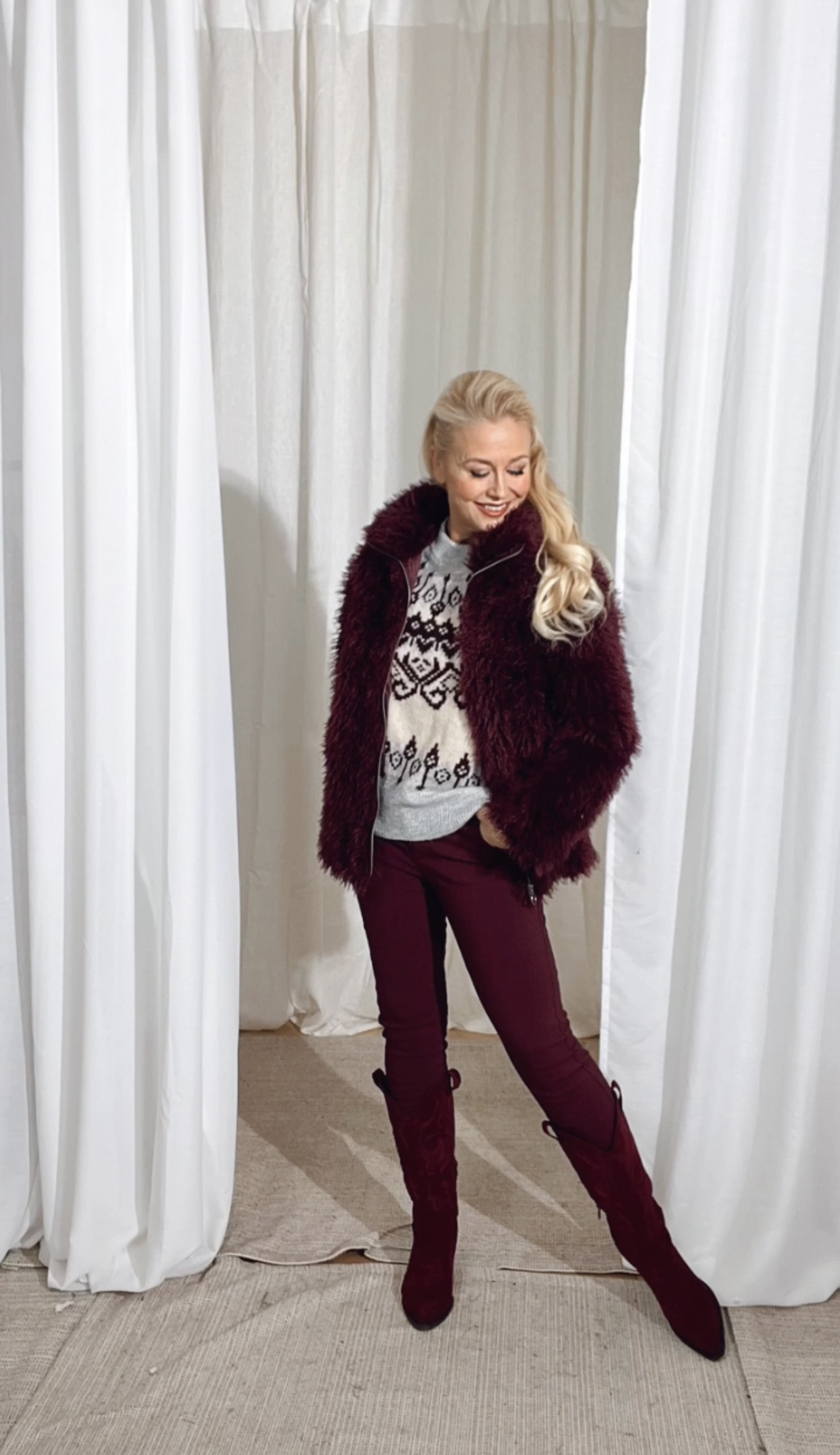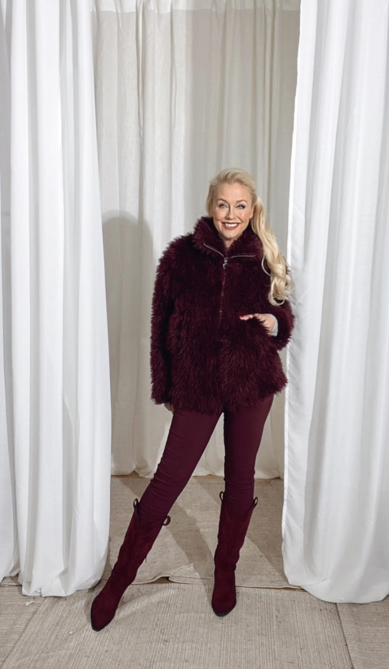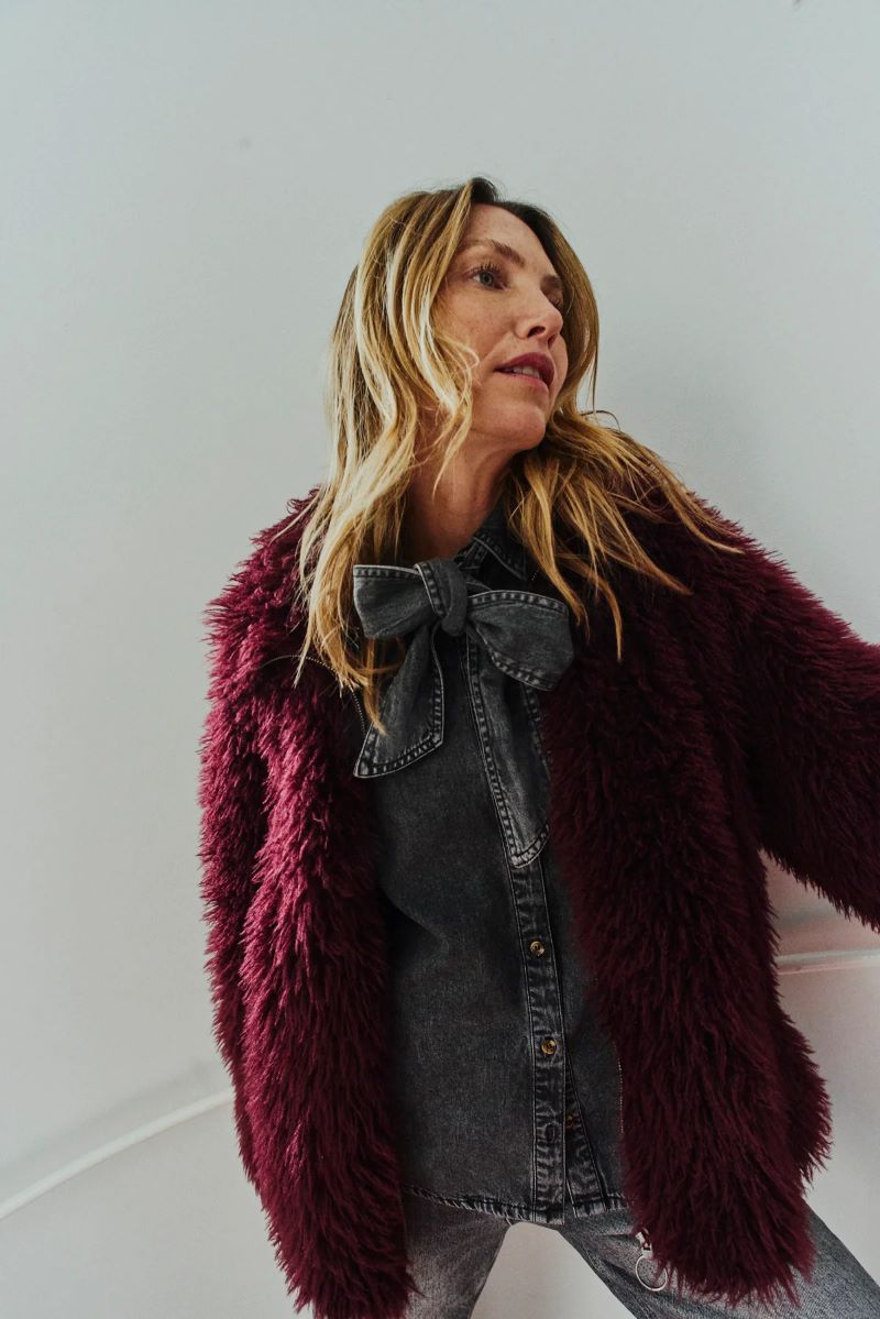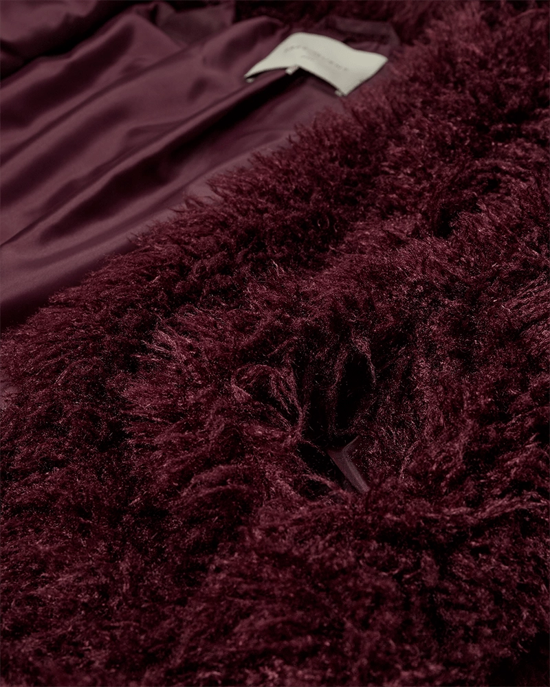 Jacka i mjukt, fransat fuskpälsmaterial med foder. Dessutom är jackan enkel i sin design med långa ärmar, dragkedja fram, hög krage samt dolda sidfickor.