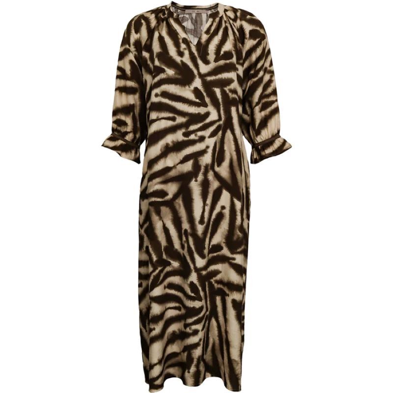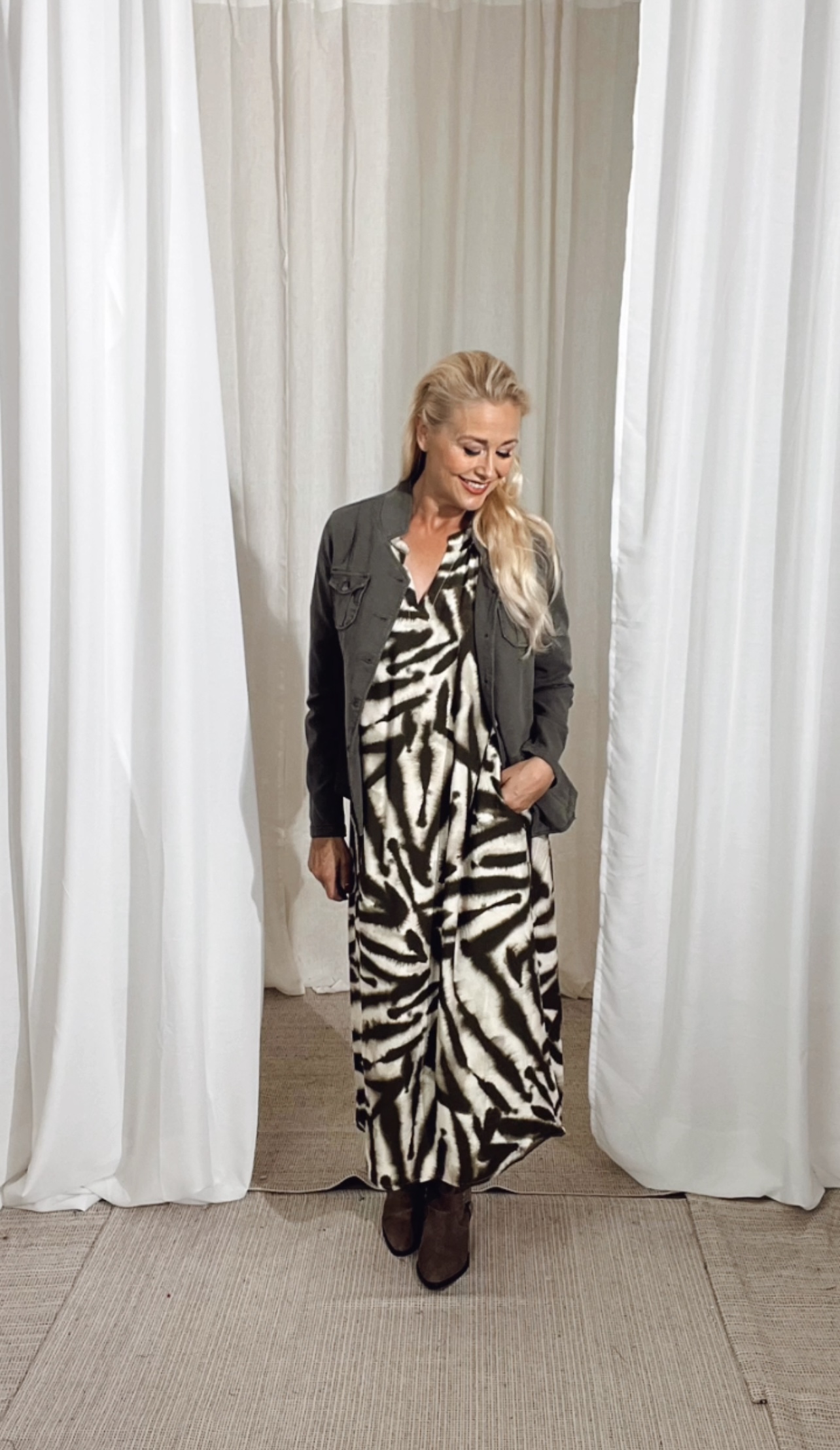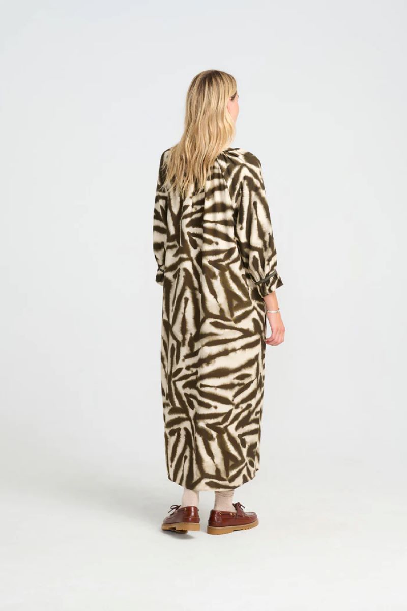 En superfin klänning med liten v-ringning som går ner till vristen och är löst sittande. Dessutom har den fina resåravslut på ärmarna med volang.