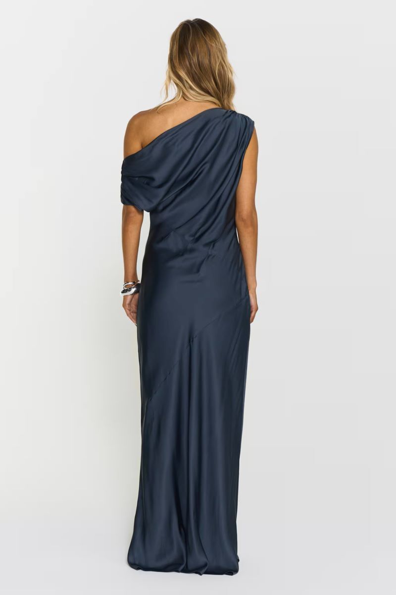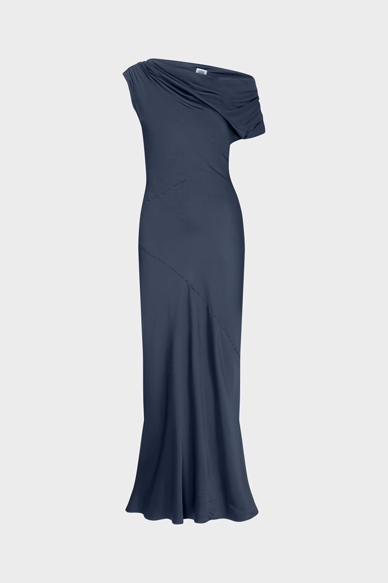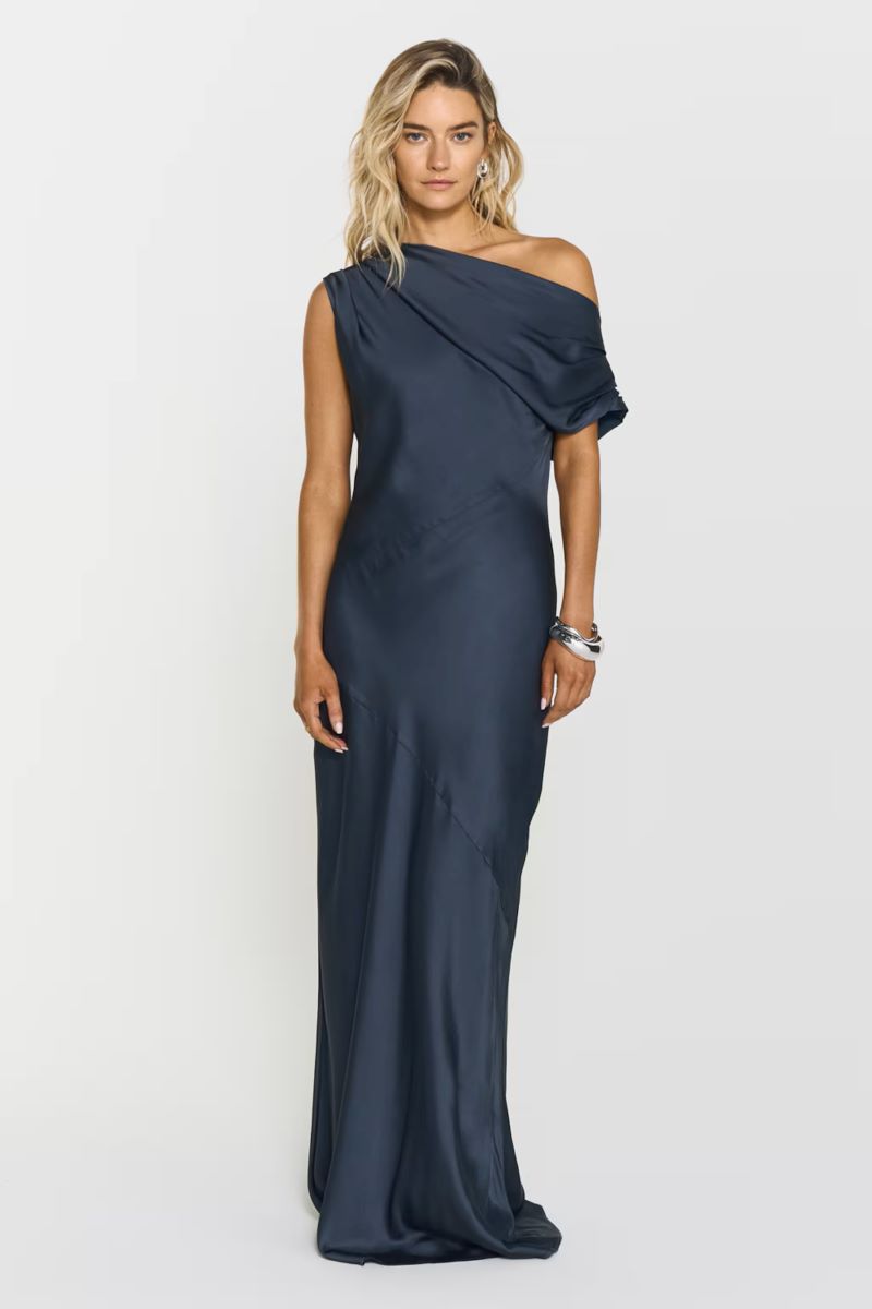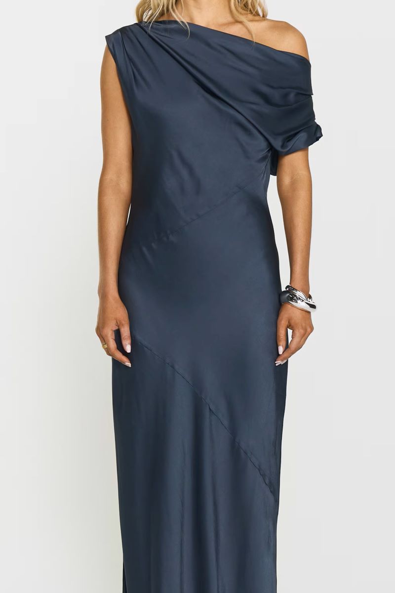 Vanessa Satin Dress har ett lyxigt satintyg, elegant halsringning och smickrande snedskuren passform. Dess maxilängd skapar en tidlös silhuett, perfekt för sommarens festligheter.