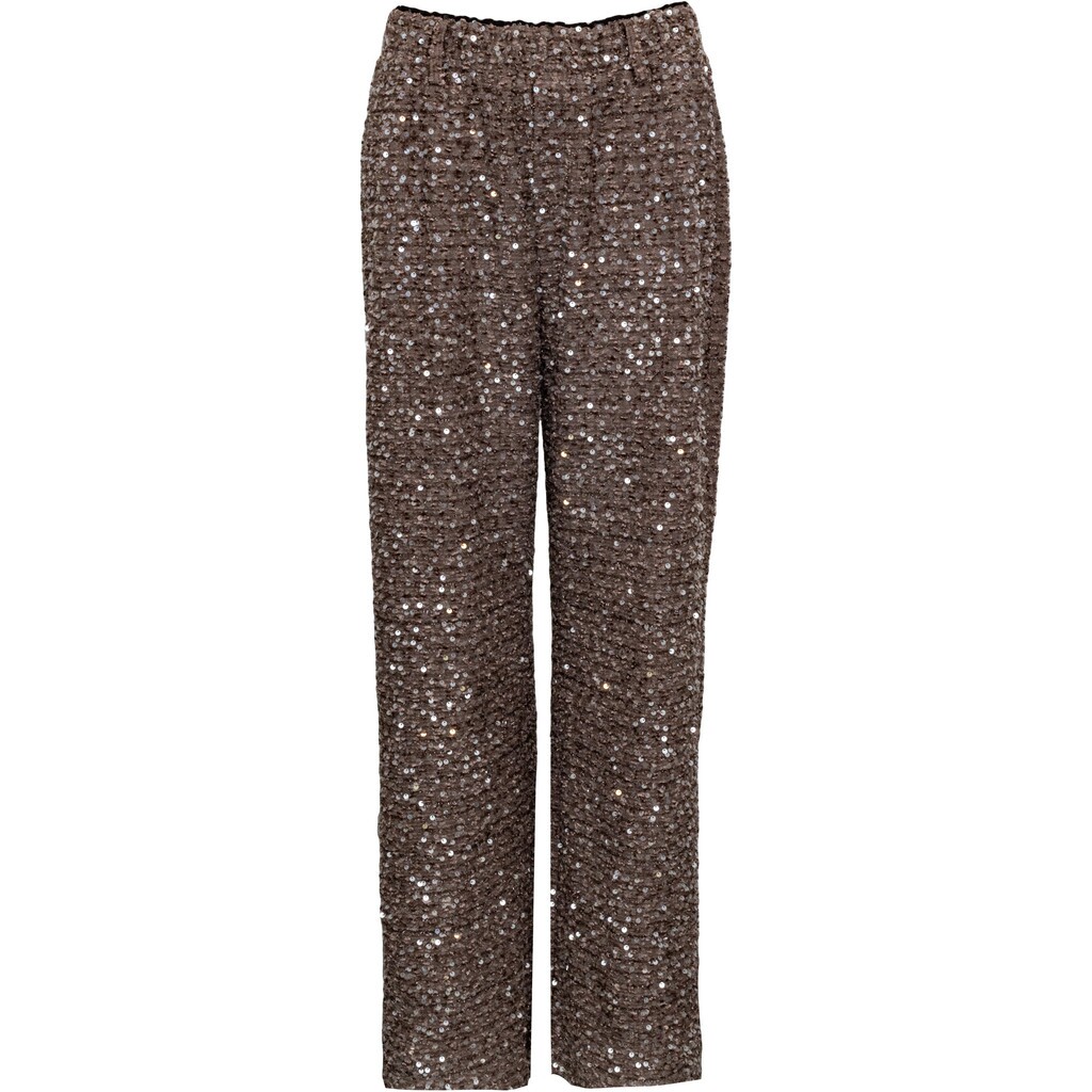Uppgradera din festlook med James Pants – en paljettbyxa som kombinerar glamour med bekvämlighet. Den jordnära bruna nyansen med glittrande paljetter ger ett sofistikerat intryck, medan den raka passformen och resåren i midjan gör dem sköna att bära hela kvällen.