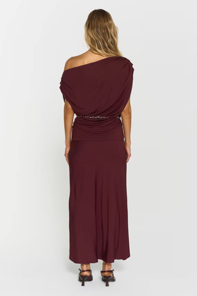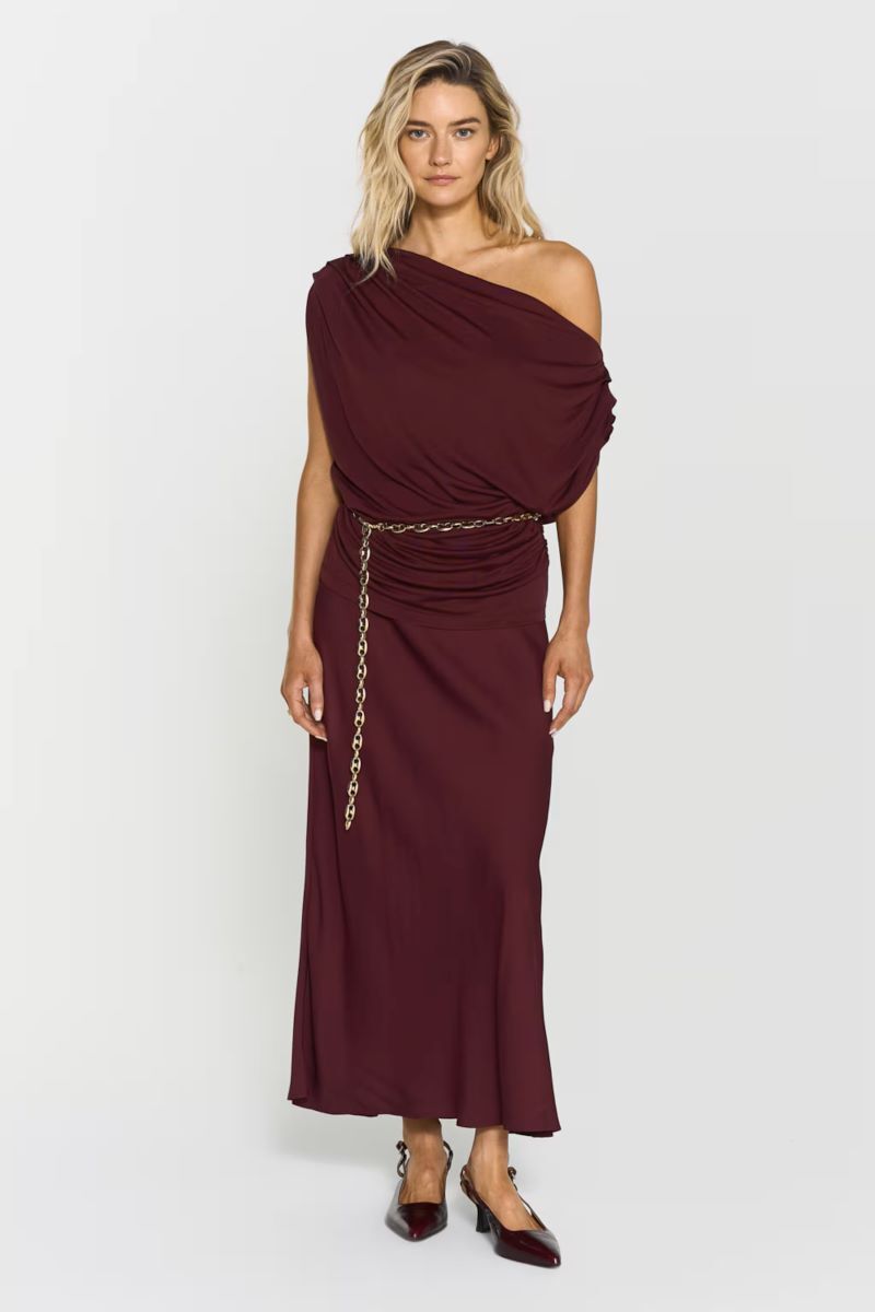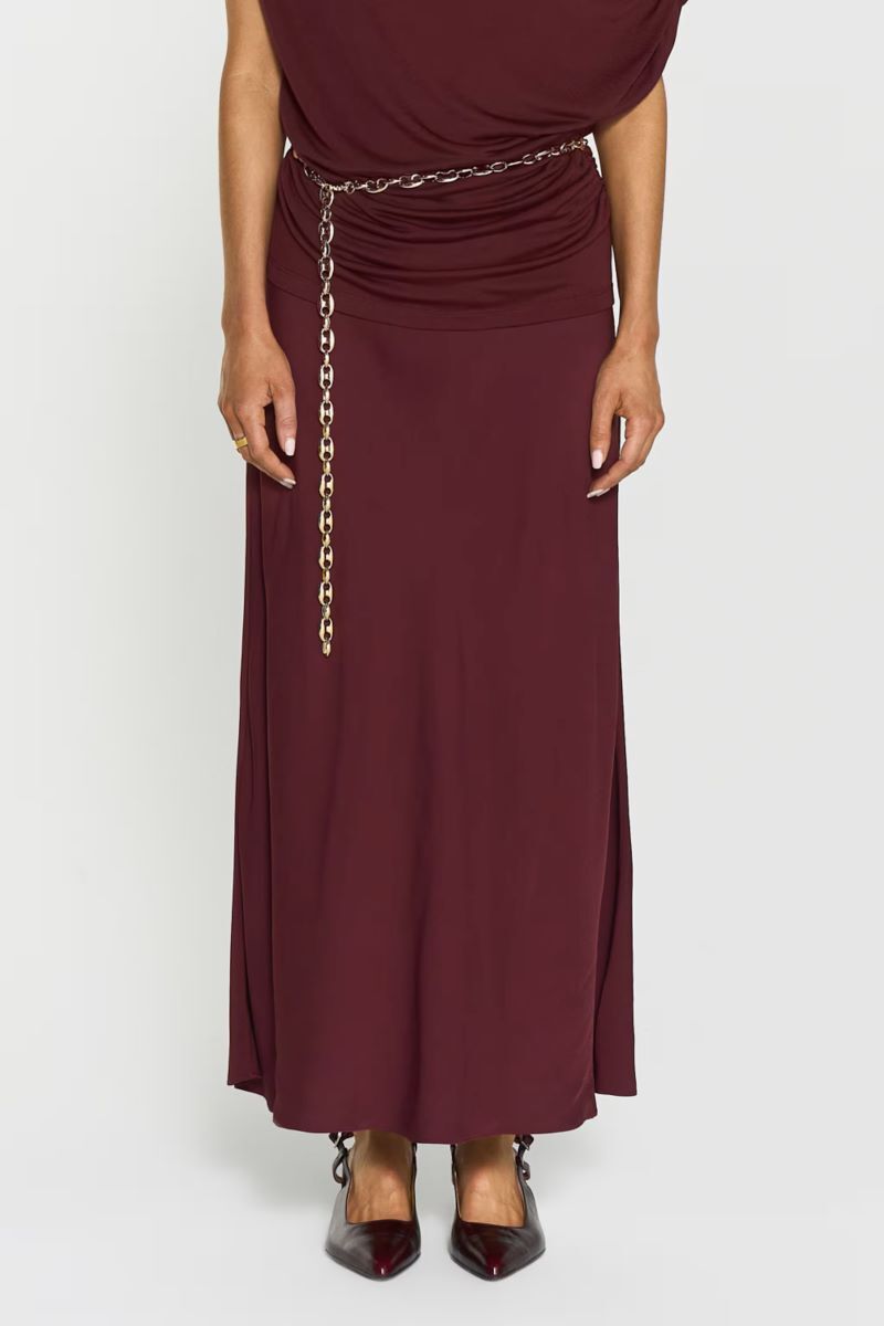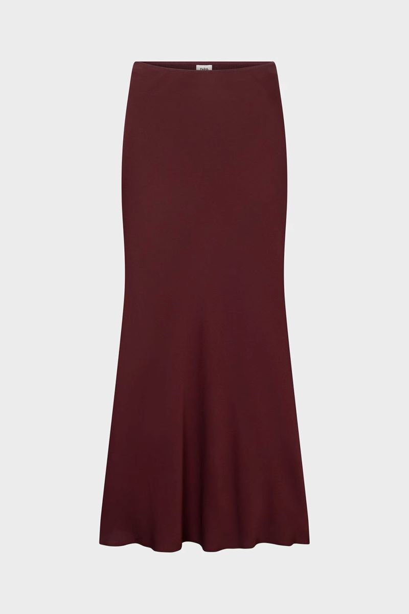 Tyne-kjol: Tillverkad av glansig satin i midilängd, med en smickrande snedskuren modell och bekväm resår i midjan.